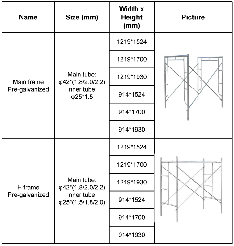 scaffold frames are widely used in construction as working platform or support system. Big Project such as bridge, tunnel,petrifaction, shipbuilding, railway, airport, dock industry and civil construction ect.Also can be used as working platform or support system for housing maintenance.